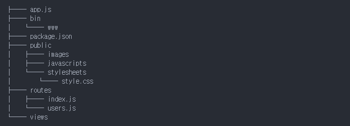 간략한 설명을 하자면, app.js가 메인 파일이고, bin아래의 www 파일은 node를 실행시키는 파일이다. public아래에는 이미지나 스타일등이 들어가고, routes아래는 말그대로 라우트할 파일들이 들어간다.