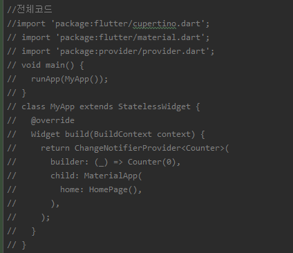 2. 변경되는 값을 사용하기 위해 최상위 부모 위젯을 ChangeNotifierProvider로 감싸준다.